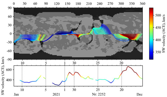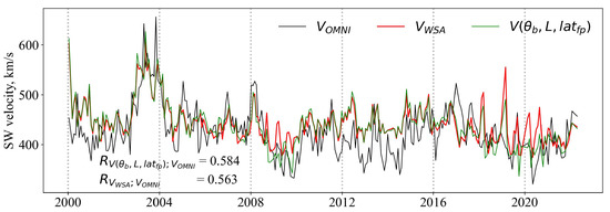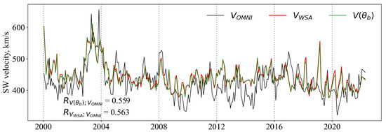 Data from the OMNIWeb database [15] were used to compare the aforementioned parameters with the observed SW speed. To partially exclude the influence of the CMEs, we did not use data after X- and M-class flares in the comparison. For the propagation of the SW from the source surface to the Earth’s orbit, the ballistic approximation is a popular solution. A description of this method can be found in [16]. We need to do the reverse procedure: compare the measured SW velocity to the parameters of the magnetic field on the source surface. The ballistic model can be very simply reversed by adding a time shift to the series of SW velocity observations. We determine the magnitude of the shift for each measured velocity value individually by dividing the distance from the source surface to 1 AU by the SW velocity. It is important to note that our approach is not an exact inversion of the ballistic model because it does not account for fast SW fluxes. After subtracting the time shift, we interpolated a series of SW velocity data to a regular grid corresponding to the calculated magnetic field parameters (Figure 2). We made calculations on a grid with steps of 2.5 degrees of longitude, which corresponded to about 4.5 h. In the present work, these data with steps of 4.5 h are used only to illustrate the dependence of SW speed on various parameters. For the quantitative analysis, we average the magnetic-field parameters and the SW speed by CR. This allows us to ignore the fluctuations during SW propagation.
