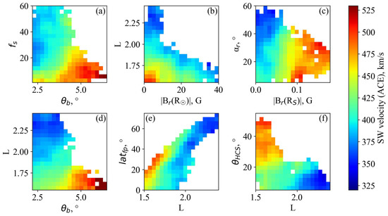 From Figure 3 we see that the SW velocity can, in general, be described by various two-parameter dependencies. We can clearly see regions of conditionally high velocities (>450 km/s, red and yellow pixels), medium velocities (400–450 km/s, light blue, and green pixels), and low velocities (<400 km/s, blue pixels). Each region corresponds to a certain range of magnetic field parameter values. Comparing Figure 3a,d, we can see that the character of the dependence of the SW velocity on the line length L is similar to the character of the SW velocity dependence on the FTE. Longer field lines, whose bases lie mainly at high latitudes, bring weak winds to the ecliptic plane. At the same time, the sources of the fastest SW flows are mid-latitude CHs (15–35 latitude, Figure 3e).