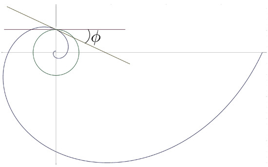This figure illustrates the geometric definition of the pitch angle, , of a logarithmic spiral. Specifically, is the angle between the line drawn tangent to the circle and the other line drawn tangent to the logarithmic spiral, as depicted. In this case, , where the negative sign indicates, by our convention, that the spiral winds outward in a counterclockwise direction.
