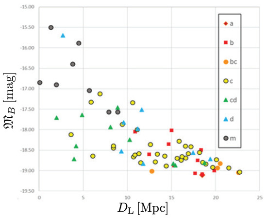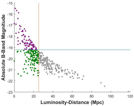 Our sample of galaxies draws 74 spiral galaxies from the CGS [54], with absolute B-band magnitude mag6 and limiting luminosity (redshift-independent) distance Mpc (). For a derivation of these sample boundaries, see (Davis et al. [53], §3). Figure 2 shows the full sample consisting of 140 spiral galaxies (volume- and magnitude-limited) from Davis et al. [53], plus our 74 faint galaxies in this study (still volume-limited, but not magnitude-limited). To remain consistent with Davis et al. [53], we adopted the same cosmographic parameters from Planck Collaboration et al. [56], with , , , and km s Mpc. Defines our sample with the same comoving volume, × Mpc and lookback time, Myr.