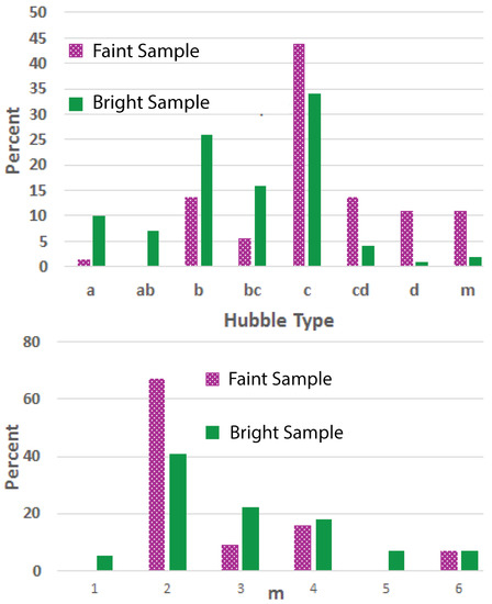Our sample is derived from the CGS [54] sample, which includes a total of 214 galaxies within × Mpc. Our study focuses on the dimmest 74/214 (34.6%) galaxies among the sample. Indeed, the dimmest 74 galaxies are morphologically distinct from its brighter counterpart of 140 galaxies. The average galaxy from the dim sample is a Hubble subtype Sc (Hubble stage, ), whereas the average bright galaxy is Hubble subtype Sbc (). Which, if we consider the two distributions of Hubble stages as normal distributions, the agreement (overlapping area) between the two normal probability distributions is 63.4%. Thus, there is a slight agreement around the mean of the combined 214 galaxies, with the noticeable disagreement of 36.6% stemming from the consistent excesses of stages for the bright sample and stages for the dim sample.