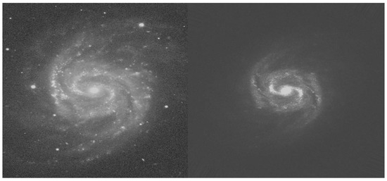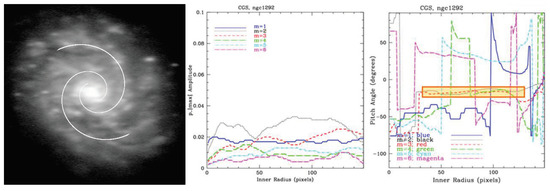 Another technique for enhancing the accuracy of pitch angle measurements is to extract the symmetrical components of the target galaxy. Such a symmetrical-component image is created by dividing the original image into pixel pairs/groups, co-radial from the center of the galaxy and symmetrically distributed in rotation angle [71,81]. Pairs/groups then adopt the lowest pixel value among them as the value for all of them. For example, for symmetry, all points radially opposed from one another at adopt the lowest pixel value of each pair; for , the lowest pixel value of the groups of four pixels apart, and so on. The algorithm for performing the symmetric component isolation for any value of m is given in (Davis et al. [71], Equation (8)), which is an extension of the original operation presented in Elmegreen et al. [81].