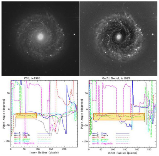 ) for IC 1993 by means of galfit [78]. (Left Column) Original B-band image and corresponding pitch angle measurement. (Right Column) Modified image using galfit to remove a Sérsic profile from the galaxy, amplifying the visibility of the spiral arms. 2dfft is capable of pitch angle measurement for both images; the user-selected stable region (highlighted orange rectangle) for the galfit-corrected image covers a larger range of galactic radii with a smaller standard deviation, thus producing a lower measurement uncertainty (, ).
