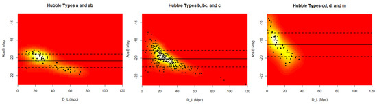 vs. diagram with mean absolute (solid horizontal lines) and standard deviation (dashed horizontal lines) of the full CGS [54] sample, sorted by Hubble type. Hubble types Sa and Sab spirals (left panel), as reported in the CGS [54], are confined to roughly mag and brighter, with a mean near mag. Galaxies identified as Sb, Sbc, and Sc (middle panel) span nearly the whole sample in magnitude. Galaxies identified as Sc, Scd, and Sm (right panel) have a mean near mag. It is expected that galaxies with later Hubble types have lower surface brightness, especially Sm dwarfs. Galaxy types through Sc, in the CGS [54], all have similar mean , while the latest types begin to deviate toward lower brightness. These heat maps illustrate increased clustering of data points with stronger hues of yellow.