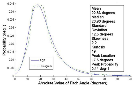 ) depicts the distribution of , modeled as a “binless” histogram, where each data point is a Gaussian with mean equal to the measured pitch angle and standard deviation equal to its associated measurement uncertainty. The blue, solid-line distribution (