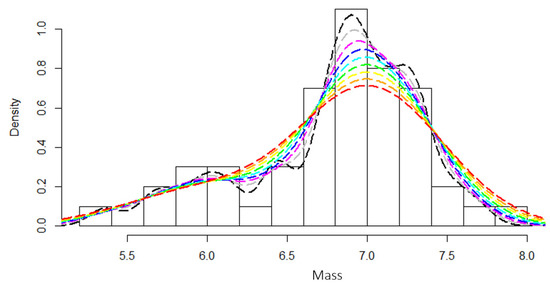 - Guidoum, A. kedd: Kernel Estimator and Bandwidth Selection for Density and Its Derivatives; R Package Version 1.0.3; R Foundation for Statistical Computing: Vienna, Austria, 2015. [Google Scholar]