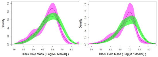 Another possible cause of the peak excess for the faint sample is the measurement success rate by Hubble type, paired with the Hubble type abundance in the sample. As compared to the Davis et al. [53] sample, ours has fewer Sa–Sbc Hubble types and an excess of Sc–Sm types. The Sc–Sm types more commonly evade pitch angle measurement. Also, the peak excess might be the result of the relative lack of Sa and Sab Hubble types in the faint sample. The absence of these higher-mass spiral galaxies from the distribution would naturally raise the probability densities estimated for all other masses.