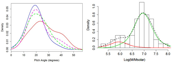 In Davis et al. [53], the probability density of pitch angles for their sample was calculated by creating a “binless” histogram which treats the dataset as a sum of Gaussians, with individual measurements and their error bars representing the means and standard deviations, respectively. This histogram was then statistically fit to a probability density function (PDF) based on the statistical properties of the dataset. This skew-kurtotic-normal fit of the PADF could then be transformed into a BHMF through the – relation [28]. We reproduce these calculations for the current dataset (Figure 9).