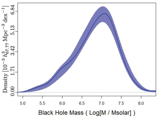 At present, the high-mass end of the BHMF has been probed through observations of the most active galaxies [4]. In the local Universe, a majority of large black holes reside in elliptical or lenticular galaxies. Their black hole masses () are estimated primarily through a correlation between their central stellar velocity dispersion, , and the mass of the SMBH [5,6,7,8]. In general, the BHMF relies on applying scaling relations to luminosity/velocity functions, and has been utilized by many authors for populations of late-type and early-type galaxies [9,10,11,12,13].
