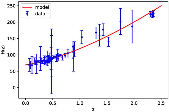 where  presents the value of the Hubble parameter []. One of the most significant quantities in cosmology is the Hubble constant because it tells us how fast the universe is expanding, which may be used to calculate the age and history of the universe. The Hubble constant is defined as the unit of measurement, which is used for describing the expansion of the universe. Hubble’s constant H is 160 km/s per million-light-years. In astrophysics, gravitational redshift is denoted by a dimensionless quantity z (which is a function of the radius of compact star r) and is defined as follows:  = Observed wavelength/Actual wavelength, as such when , it exhibits a redshift effect, otherwise it is a blueshift. In a special case, a gravitational redshift is considered as a surface redshift at the surface of the star, i.e.,  and hence one obtains  (). In essence, a surface redshift of a star is then implying that it is nothing but a gravitational redshift on the surface only, however the redshift will now be dependent on the mass or more precisely density of the star, what is generally known as the surface gravity. As such, in the case of an astrophysical object, a gravitational redshift will be maximum on the surface and minimum at the center of a compact star. In this section, we present the observational data and statistical methodology used to constrain the model parameters of the derived universe (see Figure 1 and Figure 2). Here, we applied 46  observational data points ranges  see Table 1, which were obtained by using the Markov Chain Monte Carlo (MCMC) method. To determine the best-fitting values and limits for a fitted model, we use the  statistic [,]. According to 46 observational Hubble data (OHD), the estimated values of are  kms Mpc and . To limit the model’s parameters  and m, we defined  as