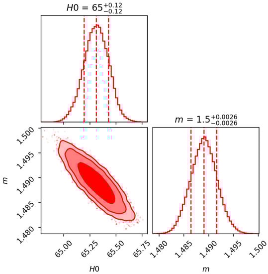 where  denotes the theoretical values of  according to [], and  denotes errors in the observed values of ”. In Figure 1, the 1-dimensional marginalized distribution and 2-dimensional contours were obtained for our derived model with 68.3%, 95.4%, and 99.7% confidence levels, respectively.
