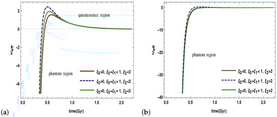 - Figure 3 shows the effective equation of state parameter involving the bulk viscous pressure . The evolutionary trajectory of the EoS parameter exhibits quintom-like behavior (transition from phantom to quintessence and evolution of the LCDM limit) for the limiting conditions of the viscosity parameter shown in (Figure 3a).