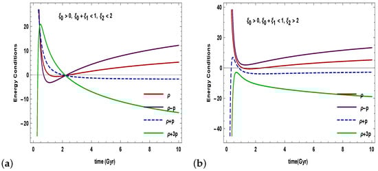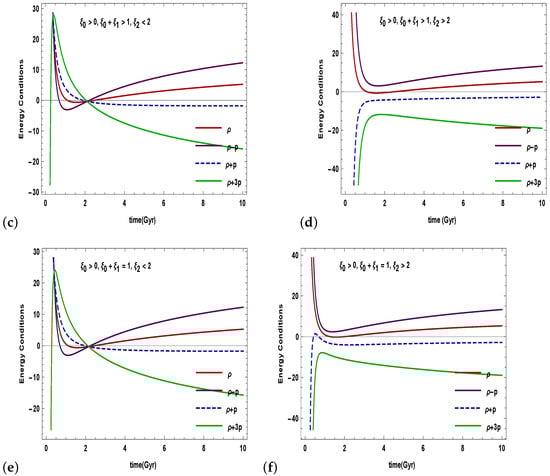 Figure 4 portrays the behavior of energy density versus time with the appropriate choice of viscous parameters as . Among all the energy conditions, the strong energy condition is in the limelight of discussion. According to the recent data on the accelerating Universe, the SEC must be violated on a cosmological scale []. The slight change in the values of  towards the negative side results in the SEC’s change. SEC violates more in the range mentioned above. We can notice this in Figure 4a,c,e for the limiting conditions of the viscosity parameter  NEC, WEC, and DEC do not violate, but SEC violates. Similarly, in Figure 4b,d,f, for , NEC is satisfied, but DEC and SEC are not satisfied.