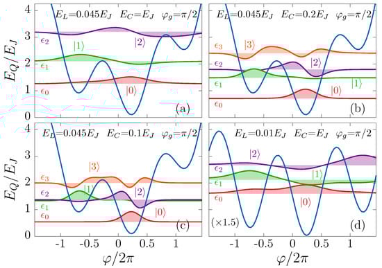 Decreasing the Coulomb energy towards the transmon regime leads to the appearance of the prohibitive barrier for transitions between the different wells, Figure 3b. As displayed in Figure 3c, further decreases in the Coulomb energy reduce the energy difference between and states. The lifetime of the first excited level may be enhanced by lowering the inductive energy . Figure 3d shows that at , the barrier is sufficiently high to ensure quasi-classical protection of the first excited level. Related discussions of the energy levels can be found in [55,57] for fluxonium-type qubits.