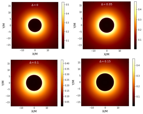 In order to show all the above in a more transparent way, in Figure 1 we present the black hole shadow for fixed M and various values of Barrow exponent , according to (27). Additionally, we have numerically calculated and depicted the intensity from (35). As we observe, with increasing Barrow parameter the size of the shadow increases, while the intensity decreases.