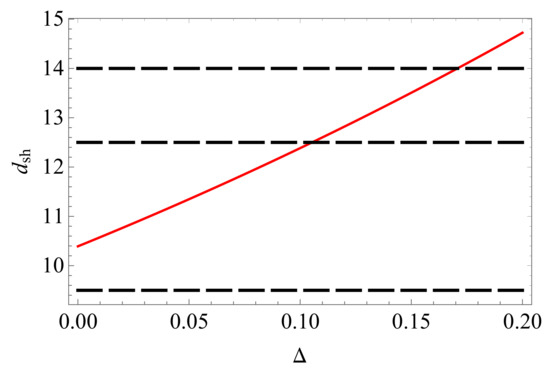 The theoretically predicted diameter per unit mass , for black holes with Barrow entropy, as a function of and for fixed . The horizontal dashed lines at 9.5 and 12.5 mark the 1 bounds according to observations, given in (36), while the horizontal dashed line at 14 marks the upper 2 bound (the lower 2 bound is not shown since it corresponds to the not physically interested region ).