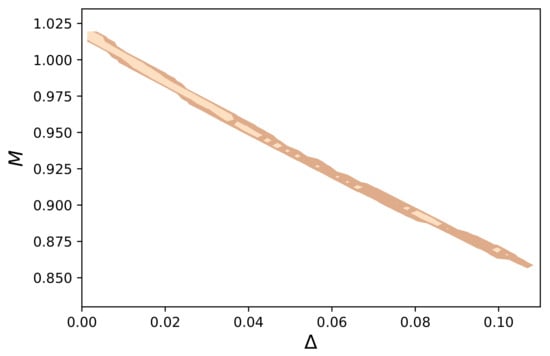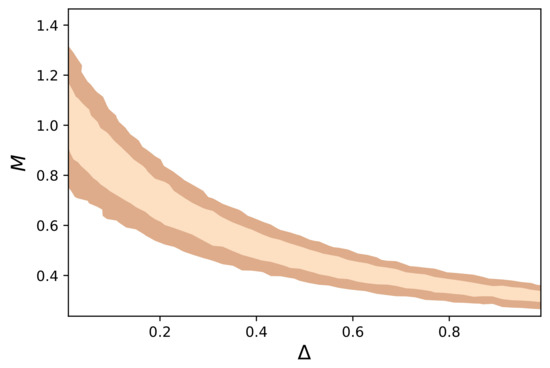 In general, one cannot find an analytical expression for and, therefore, one must elaborate numerically the equations of motion. In the present work we apply the Bayesian theorem with the likelihood function as given in [99,100], with the observational data for given in [94,97], considering and M as free parameters. In order to find the best-fit values we use the Monte-Carlo-Markov Chains analysis. For the central mass object we take along with the uniform priors and . In Figure 5 we present the region of the parameter space in agreement with S2 star data. Concerning Barrow parameter, in which we are interested in this manuscript, the best fit value and 1 errors are