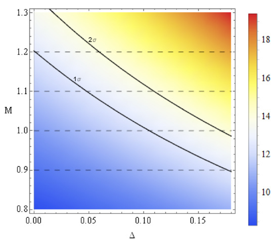 The predicted diameter per unit mass d, as a function of M and . The black curves correspond to the observationally determined upper 1 and 2 bounds given in (36) (the lower ones are not shown since they correspond to the not physically interested region ).
