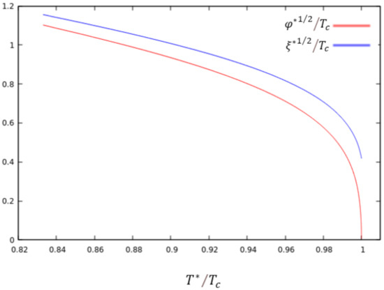 We have first, as a crosscheck of the validity of our numerical construction, reproduced known results [22,23]. In Figure 1 we demonstrate that two distinct phases appear in the system due to the formation of scalar hair on the pSAdS black hole associated with non-zero values for the scalar fields (red) and (blue) near the horizon. The phases are non-interacting in this case, as we have chosen and here. We have plotted the condensates versus , where is the critical temperature of . At this point, the value of was chosen to be , i.e., we have modelled a situation in which the order parameter described by the field has already a considerable value when the condensation of the field sets in. For it does not make sense to speak of a composite system as the system associated to is above the condensation temperature. Hence the curve for stops here.