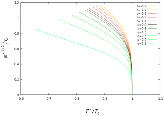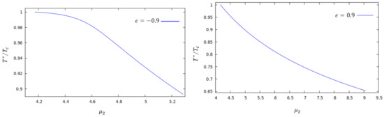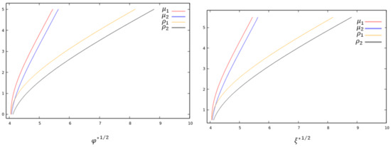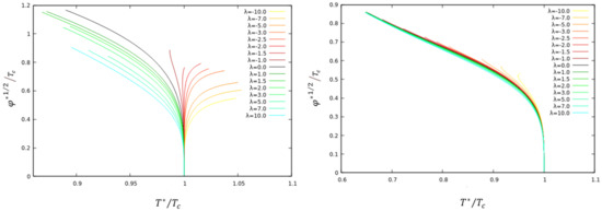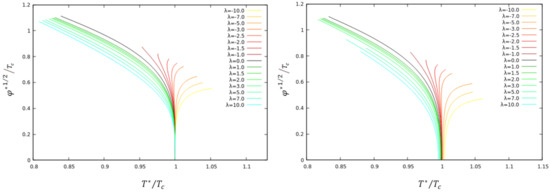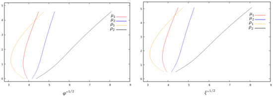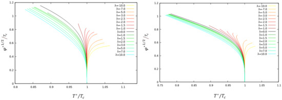 In the following, we present the curves for – the curves for can be inferred from Figure 1. In order to introduce an interaction between the two phases, we have first followed [22,23] and assumed an interaction of the scalar fields. We will hence consider and study the qualitative change of the system when varying . This is shown in Figure 2 for the balanced (left) and the unbalanced (right) case, respectively.
