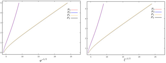 Let us now discuss the unbalanced case, which shows some interesting new features. The most interesting question here is how the chemical potentials and charge densities change when increasing the condensation values and , respectively. We can see that greatly influences the charge densities and the chemical potentials of the system. When takes values close to its negative lower bound, the inhomogeneous characteristic of the system prevails (see Figure 7), but when takes values close to its positive upper bound (see Figure 8), its dominance makes the unbalanced system almost approach a balanced system so that and .