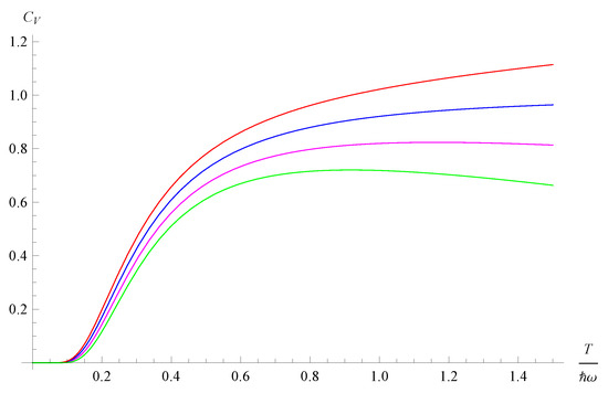 Specific heat of the oscillator in the different cases: Beltrami coordinates (green curve), Poincaré coordinates (purple curve) embedding coordinates (red curve); the blue curve corresponds to the standard harmonic oscillator. In the plot we set , in order to make the difference between the curves visible.