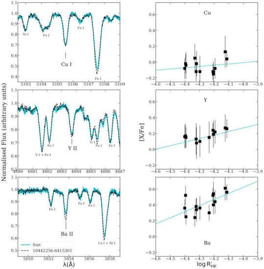The comparison clearly demonstrates that Ba ii and to a less extent Y ii lines are deeper in the young star than in the sun, and this corroborates our derived abundances ([Ba/Fe] = , and [Y/Fe] = ). Conversely, the Cu lines are almost identical in the two stars ([Cu/Fe] = in the IC 2602 star). We note similar differences also in lines for other elements, such as strong Fe i, Ca i, and Ni i (indicated in the panels). In the right-hand panels of Figure 1, we report the dependency of the derived [X/Fe] of each target as a function of their activity levels represented by ([41], computed as in [40]). While the [Cu/Fe] ratios exhibit no significant dependency on the , the correlations for [Y/Fe] and [Ba/Fe] are meaningful. In fact, we obtained a Pearson correlation coefficient of r = 0.194 (p value 0.526), r = 0.598 (p value 0.024), and r = 0.634 (p value 0.015) for Cu, Y, and Ba, respectively.