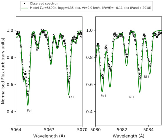 In this manuscript, we re-analyse the very same spectra but exploit our new approach to chemically characterise young stars, which is thoroughly described in Baratella’s series of papers ([39,40,56]. Briefly, our methodology makes use of titanium lines (instead of iron) to derive atmospheric parameters: this causes a considerable revision of the exceptionally large microturbulence velocities (V up to 2–2.5 km s) and sub-solar metallicity achieved for young stars (we refer the reader to our previous papers for further details). Photometric temperatures computed using Casagrande et al. (2010, [57]) and Mucciarelli et al. (2021, [58]) calibrations (adopting VJHK, and Gaia BR magnitudes, respectively) produce values ranging from ± 90 K (from JK colours) to ± 73 K from BR. We used the average from these estimates as an input value for our spectroscopic analysis (i.e., = 5431 ± 70 K). Similarly, we adopted the surface gravity from the gaia dr3 parallax of = 4.30 ± 0.03 dex and V = 0.91 ± 0.05 km s from the relationship by Dutra-Ferreira et al. (2016, [59]).