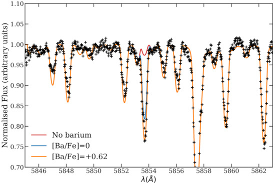 Our new analysis converges in: K, dex; V = 0.85 ± 0.15 km s and metallicity from Fe i lines of [Fe/H]i = ± 0.02 (EW scatter) ± 0.06 dex (errors due to atmospheric parameters). We detected an indication for the over-ionisation effects of Feii lines as previously found in young clusters ([60,61,62]), being [Fe/H] ii = +0.16 ± 0.03 ± 0.08 dex (the ionisation balance for iron is obviously not satisfied). Previous atmospheric parameter determinations of RZ Psc have been published by Kaminskii et al. (2000, [63]) and Potravnov et al. (2014, [50]. In particular, Kaminskii et al. derived ± 150 K (from the Boltzmann equilibrium), ± 0.02 dex; V = 2.0 ± 0.5 km s. While is in fair agreement with our estimate, the surface gravity and micorturbulence velocity are considerably discordant. Conversely, by taking into account observational uncertainties, our atmospheric model complies with the parameters by Potravnov et al., who obtained = 5350 ± 150 K (by fitting Balmer line profiles), = 4.2 ± 0.3 dex, and V = +1 km s. However, they found a sub-solar metallicity ([M/H] = ± 0.05 dex), which is in sharp contradiction with standard chemical evolution models of our Galaxy (see, e.g., [64] and Figure 11 in Baratella et al., 2020a [40]). Concerning the comparison with Punzi et al. (2018), despite the reasonable agreement in the resulting metallicity, our values of , , and microturbulence are significantly different. We emphasise that a value of = 2.0 km s as given by Punzi and colleagues does not reproduce the observed line profiles, being too large (we show an example for a wavelength region of ∼30 Å around 5080 Å in Figure 2). Once we defined the new set of atmospheric parameters using Ti lines, we then looked into the Ba line behaviour. By using the driver of the LTE code MOOG (Sneden [65], 2017 version) and MARCS model atmosphere, we synthesised the Ba ii line at 5853 Å (see Figure 3). We found [Ba/Fe] = +0.62 ± 0.14 dex. The estimate is responsible for the discrepant value between our study and Shen et al. and substantially resolves the difference in [Fe/H] and [Ba/Fe] for star RZ Psc. Stellar parameters and abundances for Fe, Ti, and Ba are reported in Table 1. Additionally, differences in line-lists and in the adopted procedure to minimise spurious trends partially contribute to the disagreement with our parameter and abundance determination.