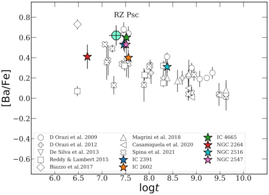 [Ba/Fe] ratios as a function of age (time in years) for clusters analysed in Baratella et al., 2021, along with previous results. The new determination of RZ Psc is labelled as a cyan octagonal symbol. For RZ Psc we adopted an age of 20 ± 5 Myr, which includes the different range reported in the literature (see discussion in the main text). The ages reported for OCs come from a single source, as detailed in Baratella et al. 2021 [39]. Credit: Figure adapted from Baratella et al. A&A, 653, A67, 2021, and reproduced with permission © ESO.