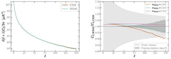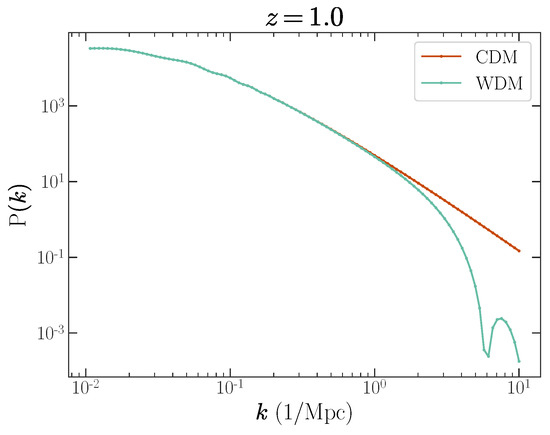 - Viel, M.; Markovič, K.; Baldi, M.; Weller, J. The non-linear matter power spectrum in warm dark matter cosmologies. Mon. Not. R. Astron. Soc. 2012, 421, 50–62. [Google Scholar] [CrossRef][Green Version]