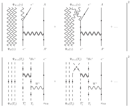 Comparison of a laser (top) to a quantum liquid amplification process for relic neutrino capture (bottom). The amplitudes for exchange terms involving the stimulated increase from N to bosons in the final-state condensate sum coherently with a positive sign following Bose–Einstein statistics.
