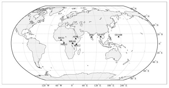 Geographic map of the study areas showing the global distribution of the eight GPS stations: MAL2, MBAR, NKLG, BJCO, ADIS, IISC, GUAM, and CUSV.