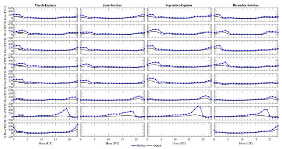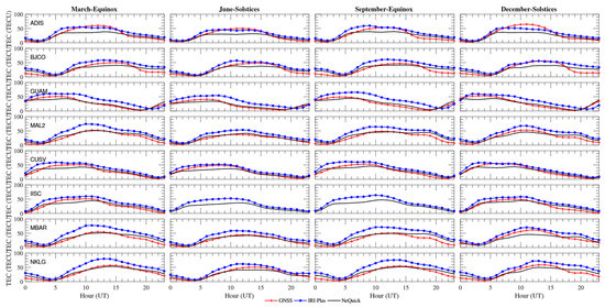 During the year 2013, the NeQuick model showed a very good agreement during the buildup period (0.0 UT–4.00 UT) but underestimates the GPS-TEC during the noon time hours (5.00 UT–13.00 UT) with a maximum of approximately −5 TECU at around 12.00 UT (Figure 2) and overestimates at nighttime in the March equinox and the December solstice. There are no GPS-TEC data in the June solstice and the September equinox. In 2014, the NeQuick model showed an agreement during the buildup period between 4.00 UT and 8.00 UT but underestimated the GPS-TEC in all the seasons except from 6.00 UT to 24.00 UT when an overestimation was observed in the June solstice. The overestimation reached the maximum at approximately 4 TECU at around 12.00 UT. In both years, the IRI-Plas overestimated the GPS-TEC at maximum in all the seasons at approximately 8 TECU at around 12.00 UT, except from 6.00 UT to 13.00 UT in the March equinox and the December solstice when an underestimation was observed.