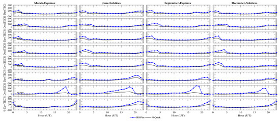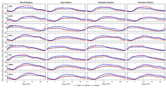 In the year 2013, the NeQuick model overestimated the GPS-TEC during the equinoxes with a maximum of approximately 5 TECU in all the time of the day but agreed fairly well during 10.00 UT–14.00 UT. It is also interesting to know that the NeQuick model showed a very good agreement with the GPS-TEC in all the hours of the day during the June solstice but underestimated between 0.00 UT to 17.00 UT with a maximum of approximately −18 TECU (Figure 5) at around 12.00 UT and overestimated from 19.00 UT to 24.00 UT during December solstices. Thus, in 2014, the NeQuick model showed a good correlation during the buildup period (i.e., 4.00 UT–8.00 UT) in all the seasons but underestimated the GPS-TEC during the daytime hours between 9.00 UT to 19.00 UT and overestimated at nighttime. In addition, the model also overestimated the GPS-TEC in all the hours of the day with a maximum of approximately 3 TECU at around 12.00 UT during the June solstice. The IRI-Plas model overestimates the GPS-TEC during all the times and seasons with a maximum of approximately 20 TECU.