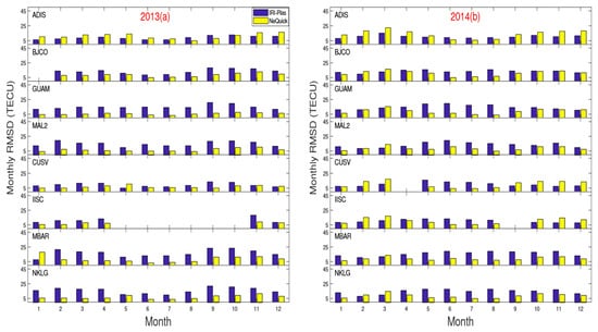 The best-case scenario for the NeQuick model is seen in the year 2013 at an equatorial station of NKLG, where the monthly RMSDs is less than 5 TECU for all the months (except for the month of May, Sept, Oct, and Nov) where the values are higher than 5 TECU. The best-case scenario for the IRI-Plas model is seen in the year 2013 at the ADIS and CUSV station, where in all the months in both stations, the RMSD is observed to be less than 13 TECU. The worst-case scenario for the NeQuick model is in the year 2014 in ADIS station when the monthly RMSD reaches 24 TECU for the month of March. For the IRI-Plas, the worst-case scenario is in the year 2013 at Guam station, where the RMDS reaches 25 TECU in the month of September.