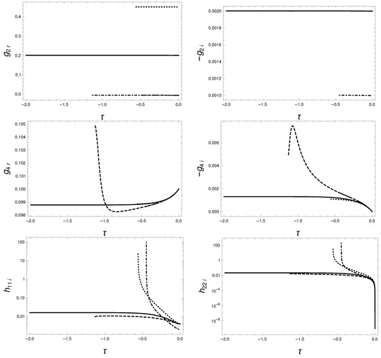The Lorentzian width of the subtraction point controls the energy interval around the where the contributions to the evolution of the running coupling constants are read off from the right hand side of Equation (27) and smaller width makes the propagating quasi-particles dominate. The general trend is that the entangled phase shrinks with the increase of , we need propagating quasi-particles to pick up the system-environment entanglement. The decrease of leads ultimately to numerical instabilities, c.f. Section 4.2. Among the initial conditions with reliable solution we found no example that the closed limit , cf. the inverse propagator (11), with would avoid the entangled phase.