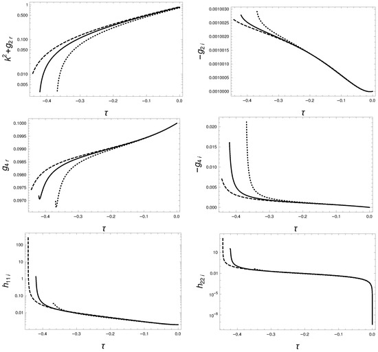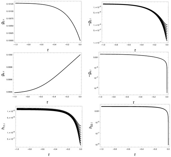 The renormalized trajectory of the symmetric non-entengled phase is shown as and is decreased in Figure 8. The limit is best tested by the convergence of or . The almost vertical evolution of and , the parameters with vanishing initial condition, is an artifact of the logarithmic plot. In terms of elementary processes, the second graph of Figure 4 drives a rapid increase of by starting in a closed theory which feeds back to accelerate the increase of the originally infinitesimal . These two processes are represented by the coefficient of the exponential function in the potential (51).