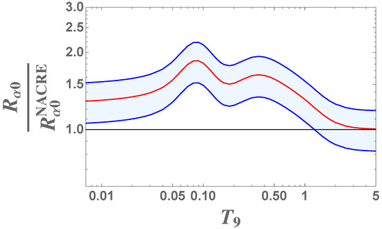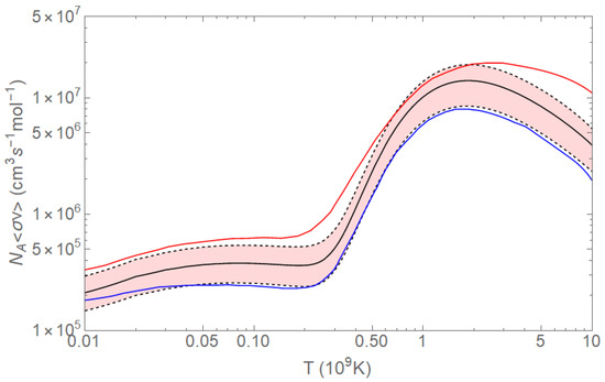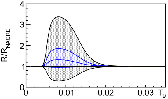 Panel (a) of Figure 3 shows the ratio (blue middle line) between the THM reaction rate and the reaction rate reported in [73] (see [77] for more details). The other blue lines in Figure 3a mark the positions of the high and low rates as deduced in [77]. The black dotted area represents the range of variation for the reaction rate of [73]. A significant variation (∼30%) can be seen in the range T = 0.02–0.07, while no significant differences are present for higher temperatures.