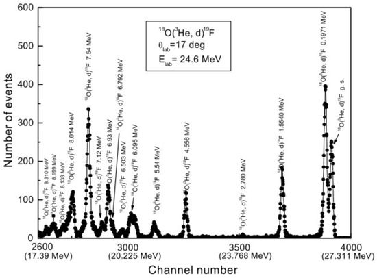 The optical model parameters (OMP’s) for the input channel were deduced from the elastically scattered He particles off O. Such OMP’s turned out to be the same of [91] and [92]. In this experiment, 11 peaks belonging to the deuterons coming from the reaction O(He,d)F were identified: such particles correspond to the transitions to the bound state of nucleus (an example can be found in Figure 5). The OMP’s for the outgoing channel were taken from the global formula of [93] at the proper energy and used to reproduce the extracted deuteron angular distributions.