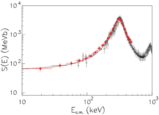 The THM investigation allowed to extract the S(E)-factor in the energy range E = 19–576 keV by normalizing the THM data to the direct ones by equating the areas under the 312 keV resonant peak due to the 12.44 MeV O level ( = 91 keV, J = 1) [99]. In order to obtain the S(E)-factor for zero relative energy, THM data were fitted taking to account the sum of a second-order polynomial and a Breit–Wigner function. In Figure 7, the THM S(E)-factor (full red dots) of [99] is shown together with the result of the fitting procedure (red line) and the direct data of [96,97,98] (open circles, open squares, and open triangles, respectively). The black line represents the Breit–Wigner parametrization discussed in [98].
