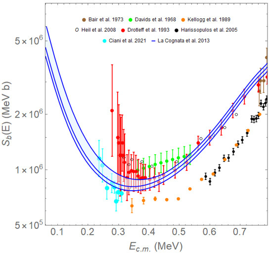 Recently, the direct measurement performed at low energies by the LUNA collaboration [131] confirmed once again the results obtained with the THM approach. Those data are reported in Figure 10 with the cyan solid points.