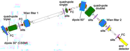As said, an RMS is an alternating series of filters and focusing elements. The first filtering element of ERNA is the CSSM placed at the shortest distance allowed by geometrical constraints from the target, about 42 cm away. Its role is to select a single charge state for both projectile and recoil ions before the actual mass separation takes place. The next filtering element is the first velocity filter (Wien filter 1) that removes most of the primary beam thanks to the fact that projectiles and recoils have similar momenta and thus different velocities. The other filters are the 60 dipole magnet and the second velocity filter (Wien filter 2) that suppress the part of the primary beam that for different reasons may pass Wien filter 1, e.g., scattering in the target area. The recoils beam focusing is provided by the magnetic quadrupole triplet, the quadrupole singlet, and the quadrupole doublet. Several FCs, slit systems, apertures, and a magnetic steerer (not shown in Figure 1) are installed along the RMS beam line for setting-up and diagnosis purposes.