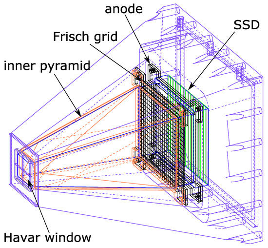 Wireframe view of a GASTLY module showing all the major components: the aluminium housing, the Havar entrance window acting as the cathode of the IC section that is defined by the inner fiberglass pyramid, the Frisch grid, the anode, and the SSD.