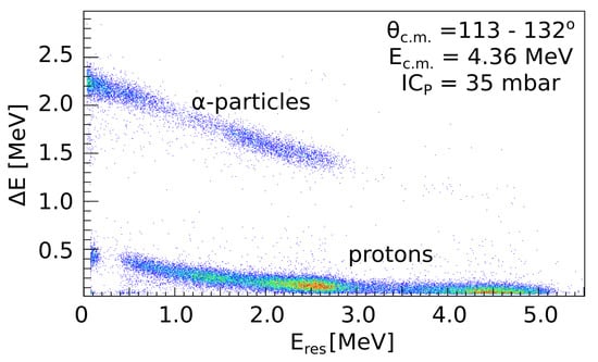 Sample - spectrum obtained with a single detector at = 4.36 MeV in the C+C measurements campaign. The protons and particles produced in the reactions are clearly identified. Adapted by permission from Springer Nature Customer Service Centre GmbH: Springer Nature, The European Physical Journal A - Hadrons and Nuclei, [30], Copyright (2018).