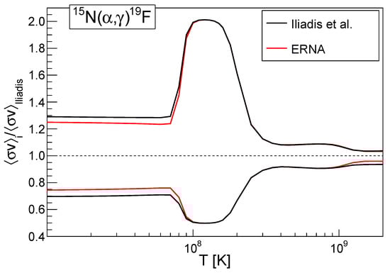 - Wilmes, S.; Wilmes, V.; Staudt, G.; Mohr, P.; Hammer, J.W. The 15N(α,γ)19F reaction and nucleosynthesis of 19F. Phys. Rev. C 2002, 66, 065802. [Google Scholar] [CrossRef]