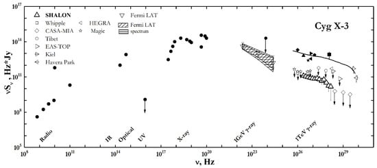 Spectral energy distribution of Cyg X-3 emission from modern and archival observations. (The black solid signs and the curve at TeV energies are the archival data and the model from [2]).