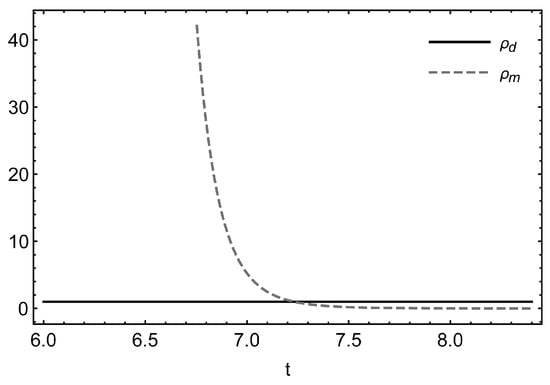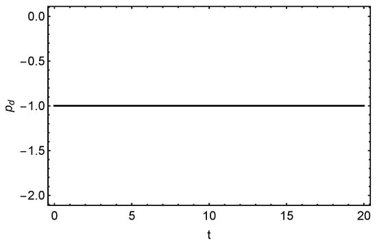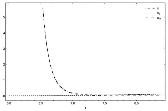 From Equations (20) and (21), it is obvious that and are functions of t. Figure 1 shows that is almost consistent throughout whereas decreases in the entire course of evolution, which are acceptable scenarios as the ambiguous DE varies slowly or is unchanged with time [,,,], on the other hand, DM diminishes continuously as a result of the galaxies scattering away from one another during expansion []. Moreover, when , . From these, it would be appropriate to conclude that the universe will be progressively dominated by this cryptic DE. Similar increasing dominant nature of DE can also be seen in [,,].