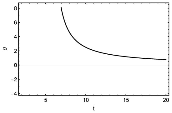 Figure 5 shows the decreasing nature of Hubble parameter H which is within the limit of the present cosmological scenario [,]. Shear scalar shows us the rate of deformation of the matter flow within the massive cosmos []. The evolution of can be seen in Figure 6. It appears to remain constant during the initial epoch, and then it tends to diverge. From these, we can summarize that the model expands with a slow and uniform change of size during the initial evolution, whereas the change becomes faster and faster in late times. This agrees with the present observation of the accelerated expansion of the universe. From Equation (32), the anisotropic parameter for so that the constructed model is isotropic.