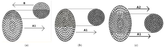 Schematic representation of the interaction of nuclei of various degrees of centrality: (a) peripheral interaction; (b) weakly central interaction; (c) strongly central interaction. The nucleon-participants are marked in darker color. The light color indicates spectator nucleons that form projectile-nucleus (A1, A2) and target-nucleus (B).